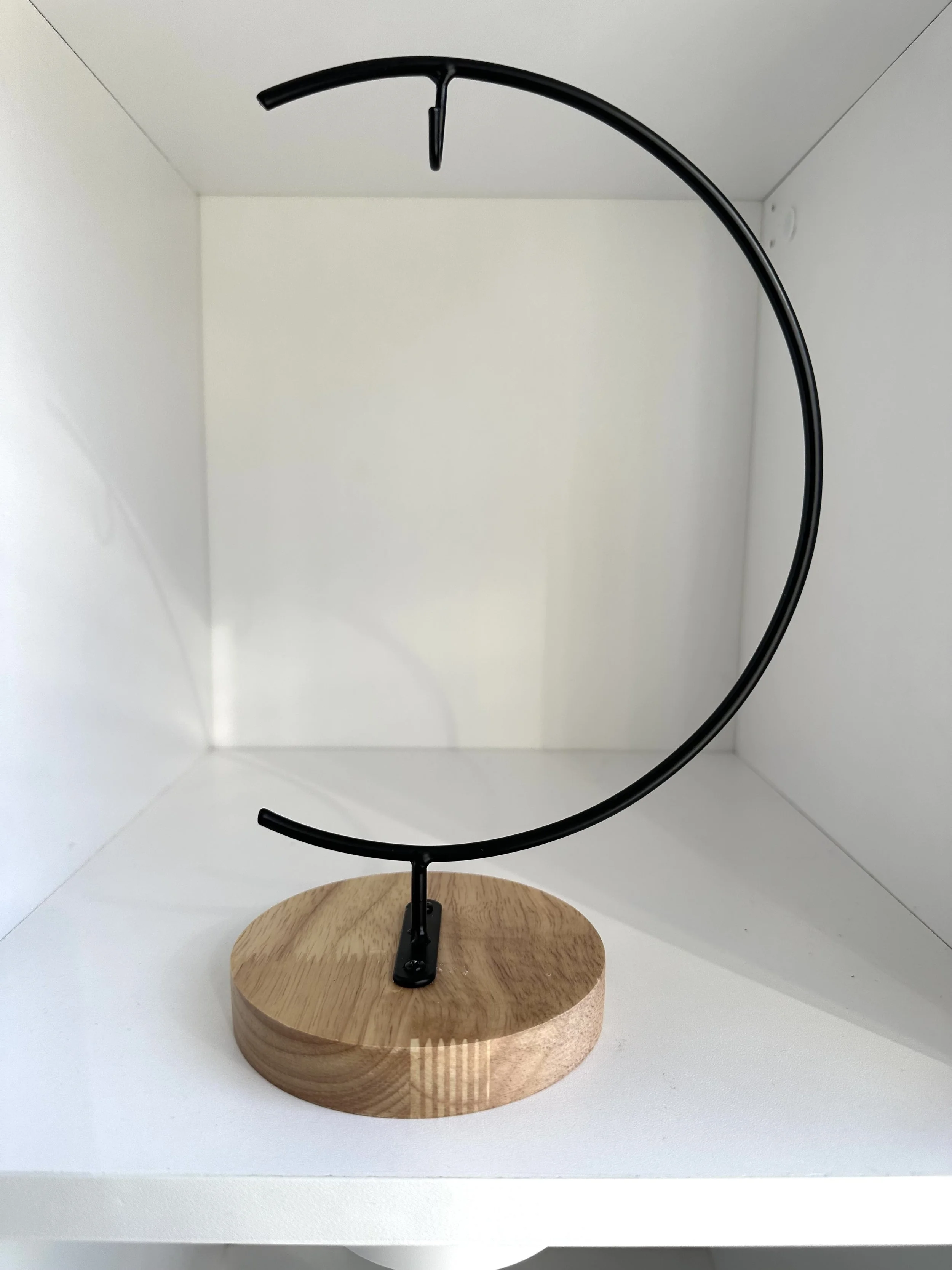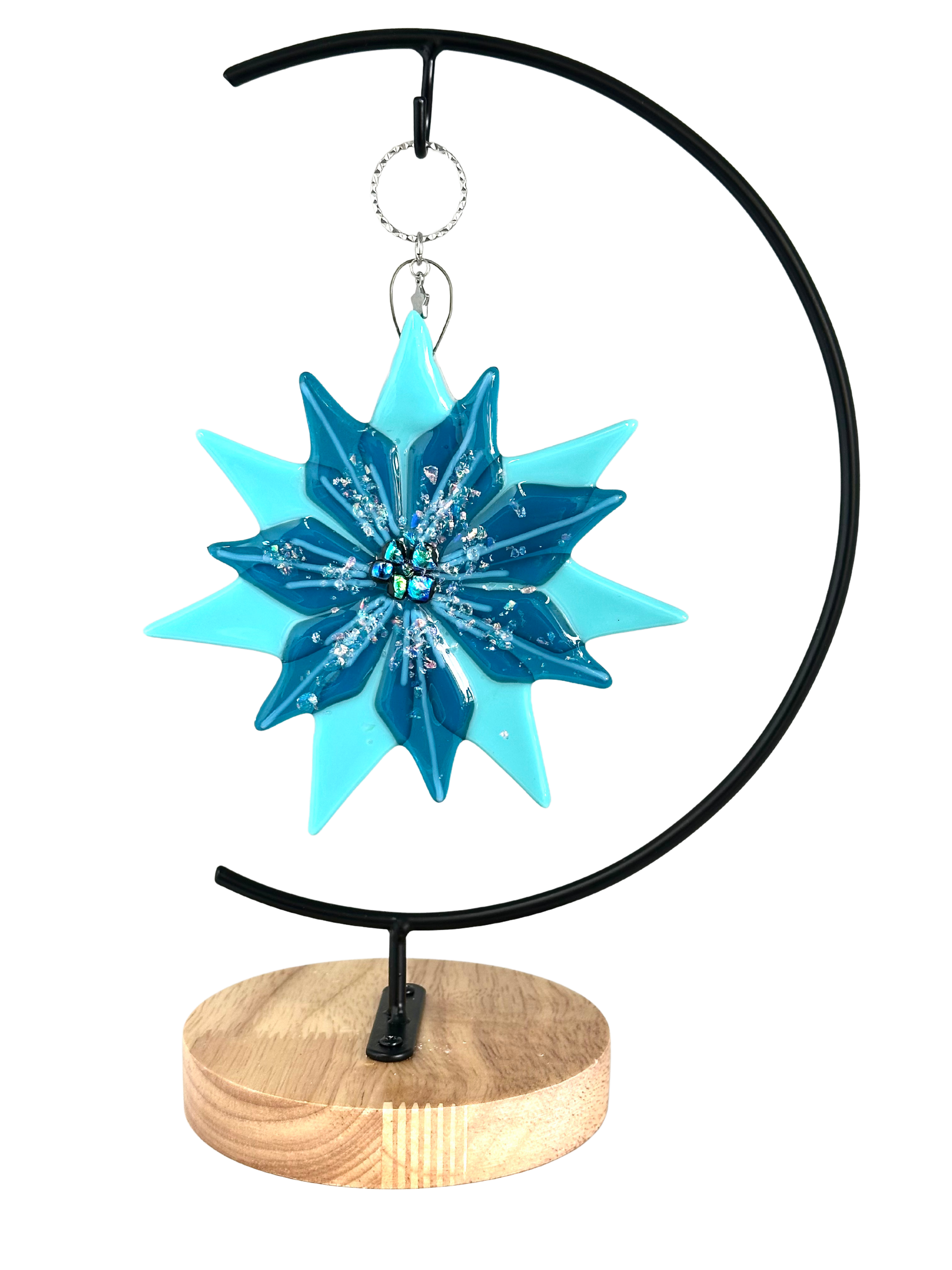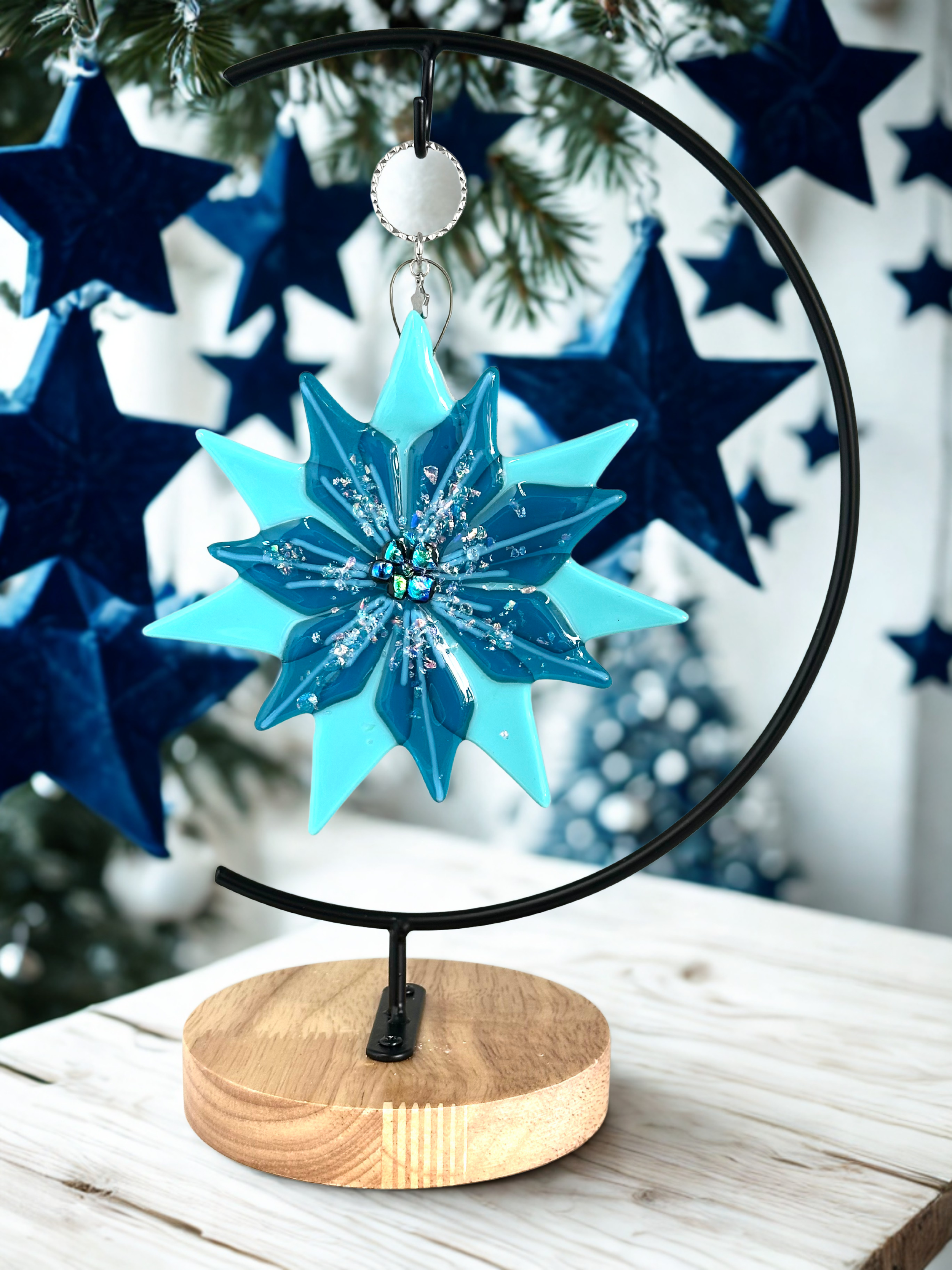 Add a touch of elegance and holiday cheer with our Handmade Fused Glass Christmas Tree Sun-Catcher and Ornament. This exquisite piece of art features multiple layers of glass, approximately 6x6 inches, embellished with shimmering dichroic and fusible glass beads. It is suspended from a silver hanger, with a stunning cascade of silver star chain draping down the front, enhancing its sparkle, charm, and the joyful sounds of Christmas. Display this charming ornament anywhere in your home with the elegant black metal and wood base stand. Measuring 11 inches by 6.5 inches. Each piece of art is a unique treasure, making it a meaningful gift to cherish and pass down through generations. Perfect for decorating your home or as a timeless, thoughtful gift.